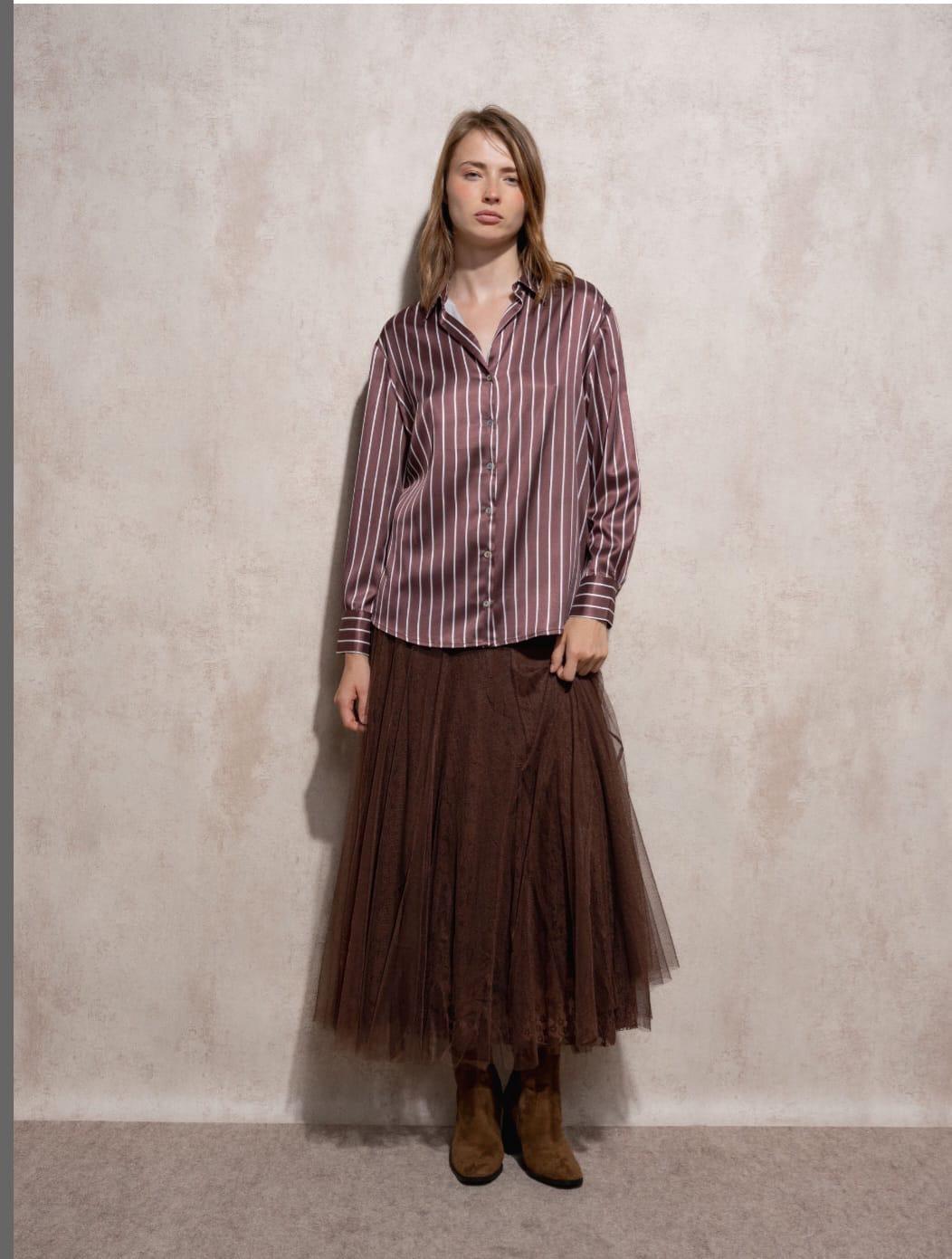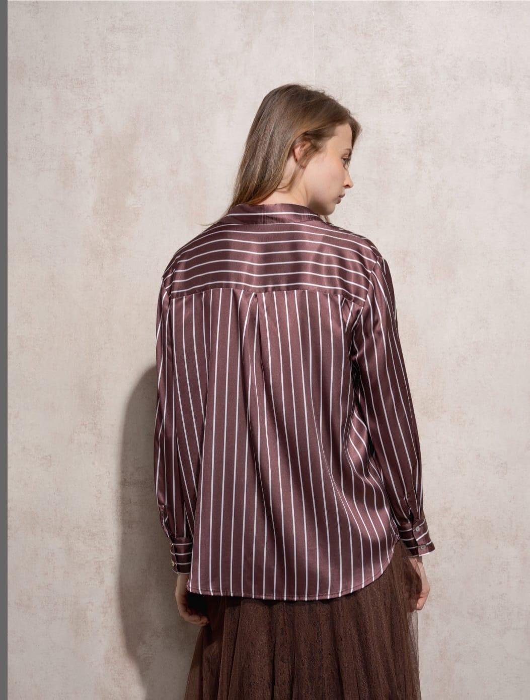 Blusa amplia de rayas. Sobre fondo marrón chocolate