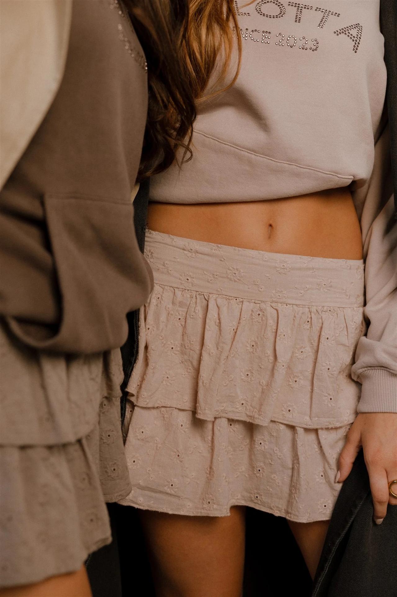 Femenina y con mucho movimiento, esta falda destaca por sus delicados volantes que aportan fluidez y un aire romántico.
