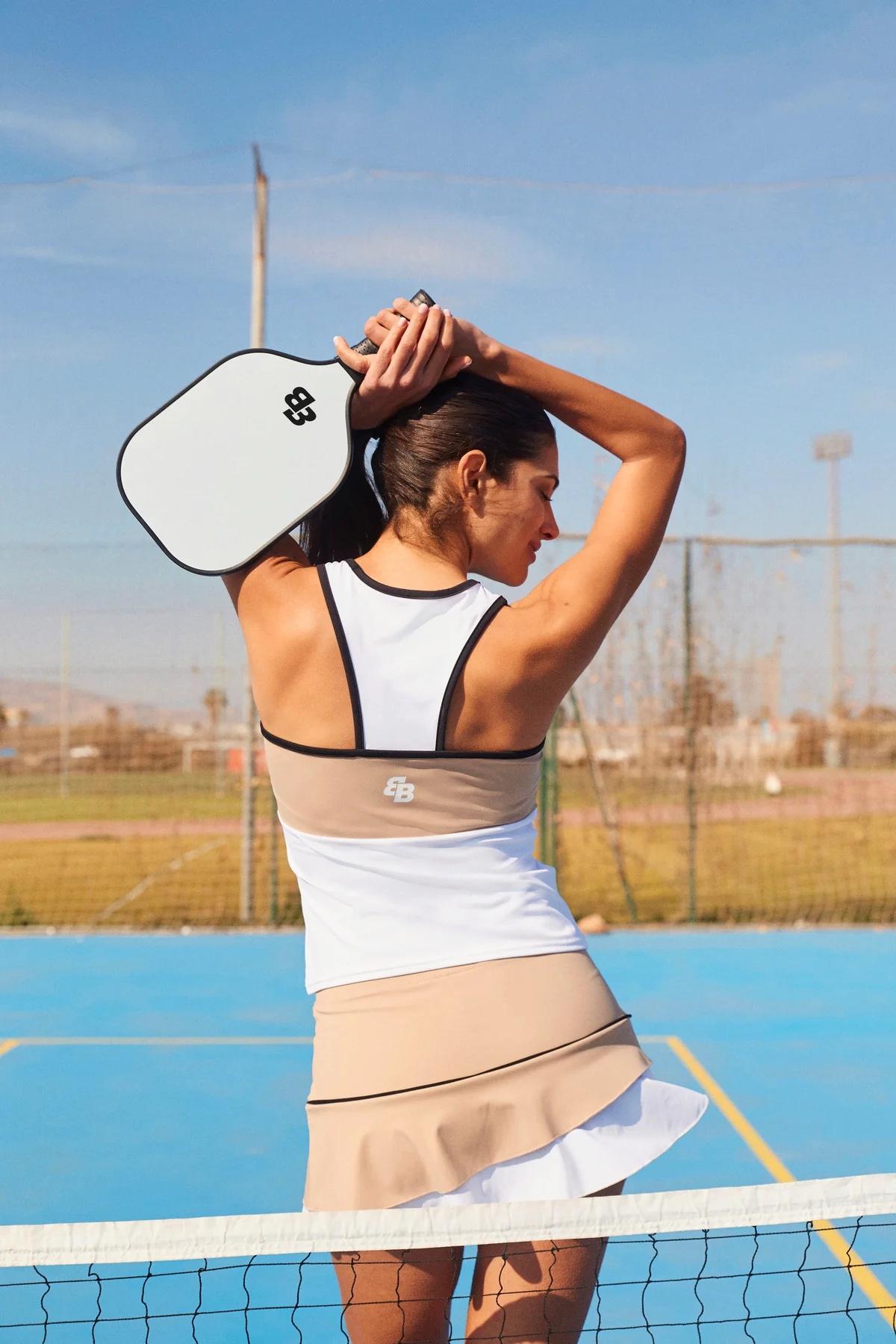 La falda Kali Beige es encantadora, combina un suave color beige con detalles en blanco. Esta falda cuenta con dos volantes que añaden un toque de dinamismo y feminidad a su diseño. Los volantes, dispuestos de manera elegante, crean un efecto de movimiento que es perfecto para cuando estas jugando. La cintura es cómoda y se ajusta bien, mientras que el tejido ligero y fluido permite que la falda se mueva con gracia. Descubre nuestra falda Kali diseñada para brillar en la pista de pádel, tenis y pickleball.