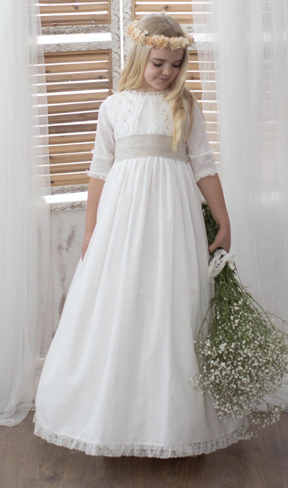 Vestido de comunión realizado en lino algodón color ivore, con textura vaporosa y delicada.