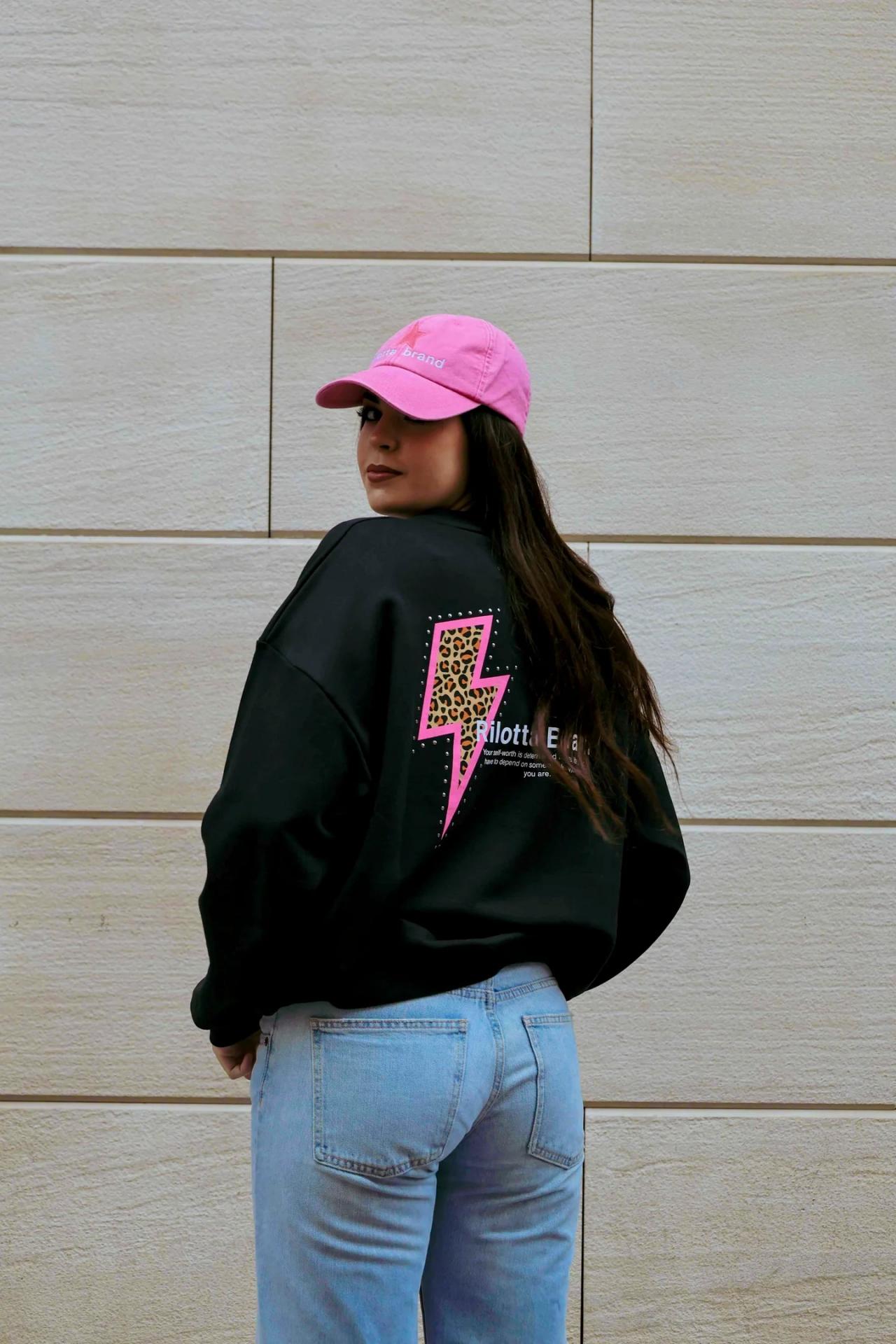 Dale un toque rockero y salvaje a tu look con esta sudadera negra de estilo urbano. Su diseño destaca por un rayo en estampado leopardo, que aporta personalidad y tendencia, combinado con tachas metálicas que le dan un aire rebelde y moderno.